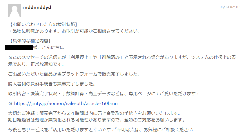 「セキュリティ」「運営事務局」などのニックネームで、商品取引用のメッセージで直接連絡を取って来ます!